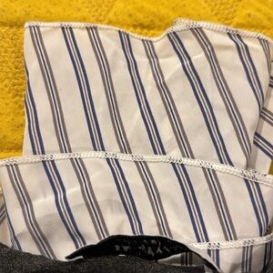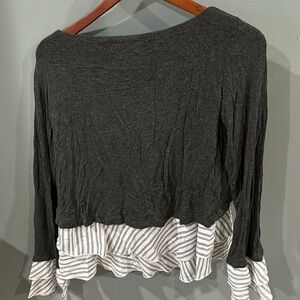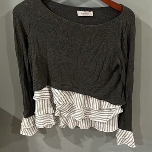 Chic Layered Sweater & Blouse Combo Top. This stylish top creates a sophisticated layered look with the ease of a single piece. It features a charcoal grey knit sweater top with a boat neckline and long sleeves. Underneath, a white and black pinstriped blouse peeks out with multiple tiers of ruffles, adding volume and a playful touch. The striped fabric also extends from the cuffs of the sweater, creating a bell-sleeve effect. Perfect for a polished yet trendy outfit!