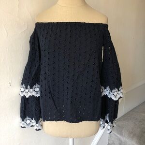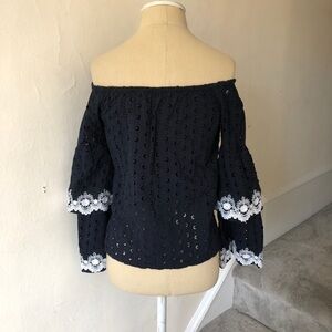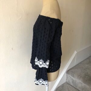 This gorgeous top by Bailey44 is made from navy eyelet fabric with white lace trim details. This top sits off the shoulder and has a tiered bell sleeve. Jersey lined, the top is fun and flirty as well as comfortable.