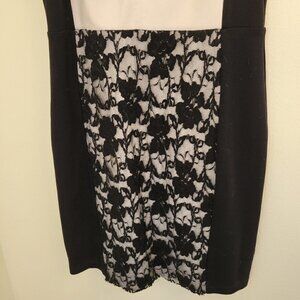 Gorgeous Bailey 44 dress featuring an ivory faux leather bodice paired with a black lace-insert skirt. Chic and modern color blocking with a flattering silhouette.