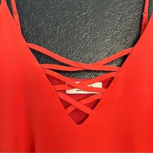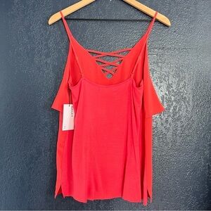 Soft silky spaghetti strap top features a V-neck cut with cross lace-up detailing at the chest, adjustable spaghetti straps, and silky smooth fabric. New with tags.