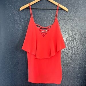 Soft silky spaghetti strap top features a V-neck cut with cross lace-up detailing at the chest, adjustable spaghetti straps, and silky smooth fabric. New with tags.