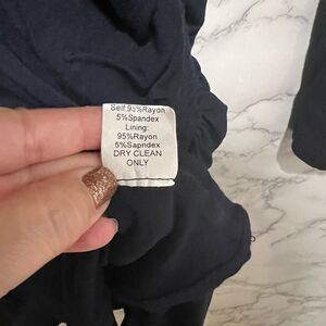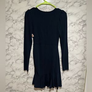 Leonora is a faux-wrap cocktail dress in a deep dark blue color (a few shades away from black). The fabric is a buttery soft jersey-like material with an inner lining throughout the bodice. Everything from the cinched waist, flared shoulders, deep v neckline, ruched side body, and fluttering skirt accentuates small waistlines.