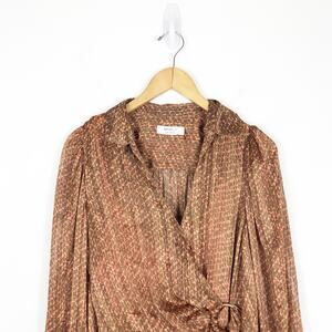 $275 Bailey 44 Malaysia Mini Wrap Dress Size Large Coral Brown Print 70s Billowy