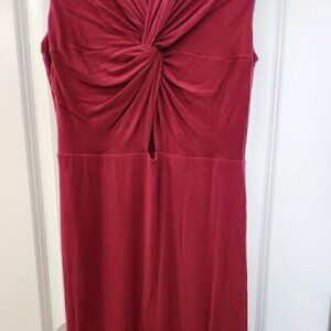 Lovely sleeveless burgundy sheath dress. Stretchy knit. Scoop neckline. Elastic waist. Features a twisted knot on the front accented with ruching. Keyhole cut out detail at the waist. Fully lined.