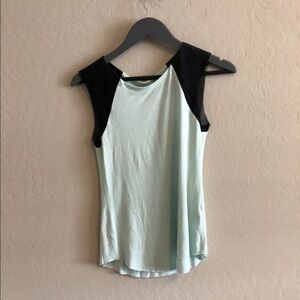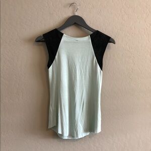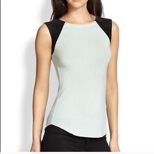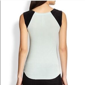 94% Rayon/6% Spandex; Contrast: 100% Leather Made in US Dry Clean Only Rounded hem Raw edges Mint/charcoal color