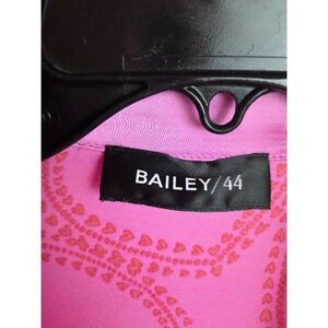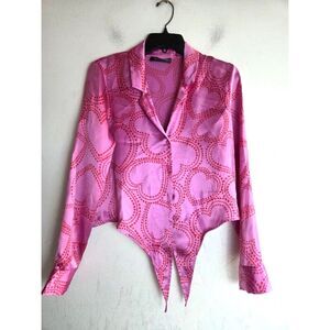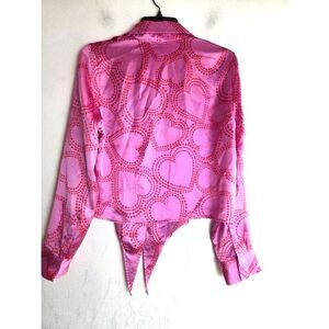 Bailey 44 Pink w/Red Hearts Print Vegan Silk/Satin Button Up Tie Front Top Med, great condition
