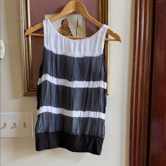Stylish tank top with bold black and white stripes. Perfect for layering or wearing alone. Made in the USA 100% silk body with a 94% rayon 6% spandex contrasting waist!