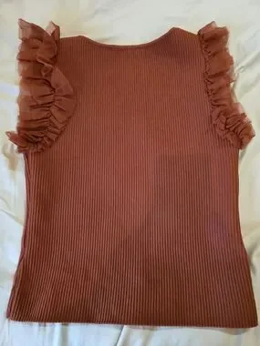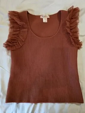 Bailey 44 ribbed tank top with delicate ruffle sleeves. Soft, breathable knit in a warm rust tone. Versatile sleeveless silhouette ideal for layering or wearing solo. Elegant ruffle detail adds feminine flair.