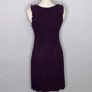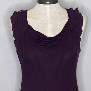 Bailey 44 Sleeveless Draped Neck Knit Dress - Size Medium. Fair pre-owned condition. Minor pilling from wash wear. Care tag has been removed by previous owner. I'm guessing a rayon blend. Very slinky with lots of stretch. Color is a dark purple. Raw edged tiers of fabric on shoulders. Draped fabric scooped neck line. Interesting seaming design, show in pic. Approximate measurements: 14 1/2" bust (remember, lots of stretch), 37" length.