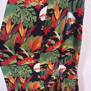 Features: repeated bird and tropical plant pattern, tie detail on front and back, slightly flared bottom, great resort wear outfit, vacation