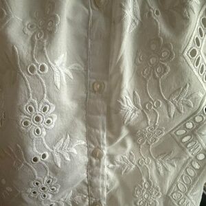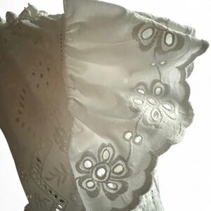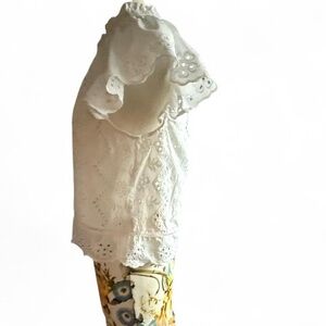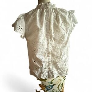 Additional Details: Delicate cotton lace fabric Ruffle details at collar, sleeves, and hemline Short sleeves with feminine finish Back button closure Timeless, versatile blouse perfect for work or casual chic looks