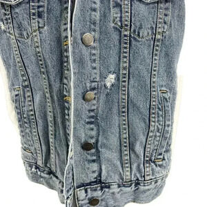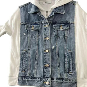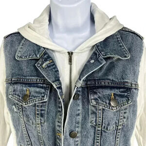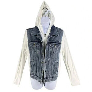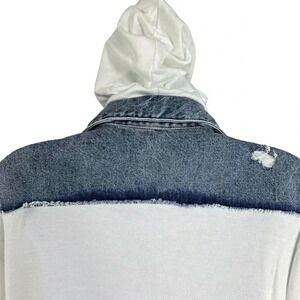 Bailey 44 Womens Size Large Denim and White Super Soft Stretchy Arms Hood & Back With Brushed Silver Buttons and Hidden Zipper