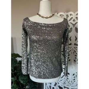 Beautiful mini sequin off the shoulder top. Perfect for a special celebration or night on the town. One inch soft elastic band around top to hold in place off shoulder. 17” without stretching. The hem is unfinished so there are a few tiny places where sequins s are missing. See image. Otherwise great condition!