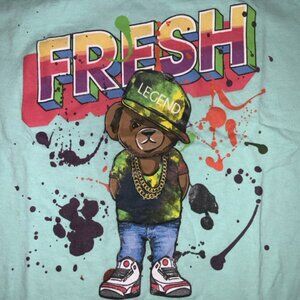 Introduce a dash of urban flair to your child's wardrobe with the Bailey Apparel OG Hustle Kids Sm Graphic Fresh Bear Streetwear Green Shirt. Specifically designed to cater to kids with a taste for hip street styles, this shirt features a striking graphic of a fashionably cool bear adorned with trendy accessories. Set against a vibrant green backdrop that exudes freshness, the bear is coupled with bold, graffiti-style lettering that spells out 'FRESH' in a burst of lively colors that capture the essence of youthful energy and swagger. Splashes of paint-like details further enhance the shirt's street-inspired aesthetic. Crafted from a soft, breathable fabric that ensures all-day comfort, this shirt is ideal for active kids who appreciate a combination of style and comfort. The shirt's durable construction promises longevity, even through the roughest playdates and wash cycles.