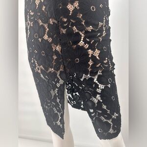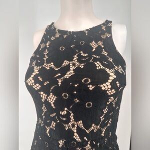 Bailey Blue Lace Cocktail Dress. Black lace with nude beige underlay which stops above the hem. Slit in the front. Small keyhole in the back. Size Small