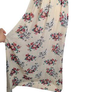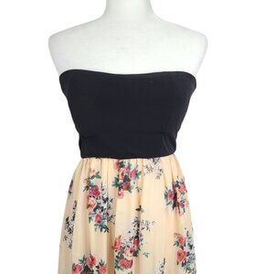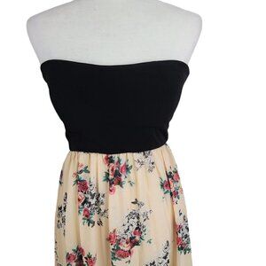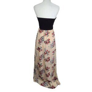 Black tube padded empire top with heart shaped neckline that drops to a flowy cream floral printed, fully lined maxi skirt