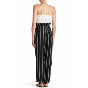 A classic black and white stripe print details the hem of this woven jumpsuit with a solid contrasting upper and a chic tied waistline that is perfect for your next event.