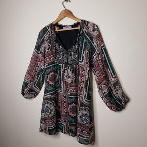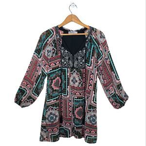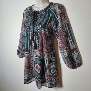 This is an adorable, Patterned, Long Sleeve, Boho, Tunic/Dress that features dangling beaded tassels you can tie or leave down 😊 This tunic is a size small and in great condition with no flaws to note ❤️