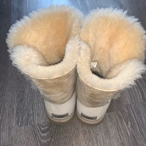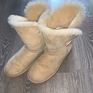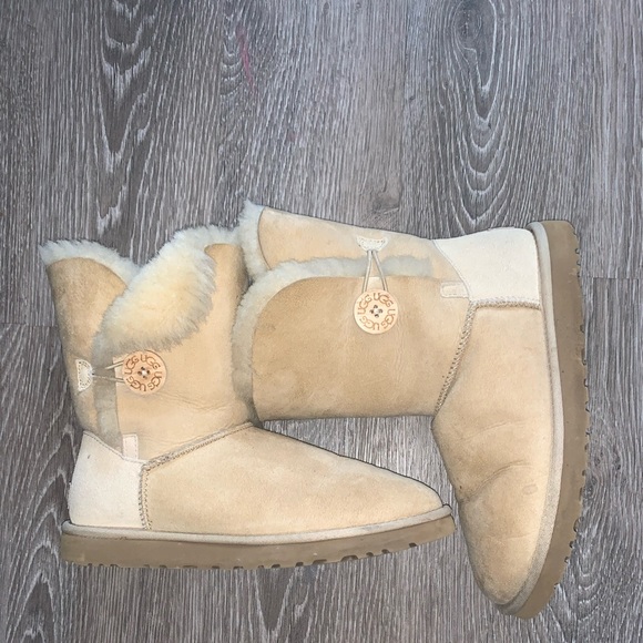 Good condition. Embellished with a wood-button closure, this plush sheepskin boot is more versatile than ever – fasten for extra warmth, or fold down for a full, fluffy collar. Finished with our signature sole for added cushioning, traction, and durabilit