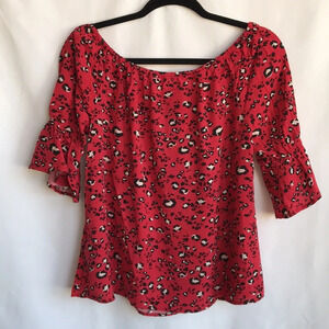 Bailey & Chloe red leopard print rayon Boho top, size M. Generally good preowned condition. Can be worn off the shoulder or on.