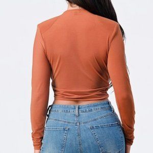 Deep neck cut out, long sleeves and a sheer backing. Shoulders are lightly padded for a little power structure.