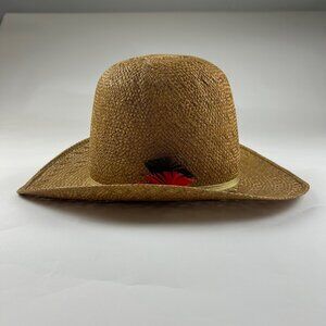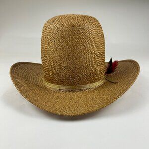 Excellent used condition, tightly woven wicker hat has no significant signs of natural wear and no defects. Ultra high top rounded design, firm brim, simple ribbon & feather accent. Please reference photos for sizing info. Overall hat is approx 6.5" tall.