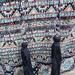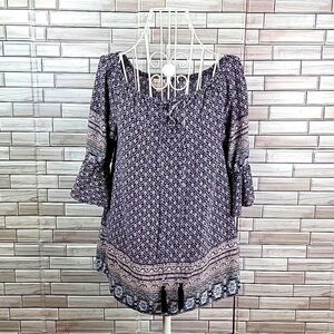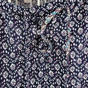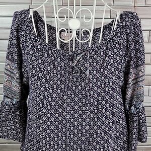 100% rayon soft flowy blouse by Bailey and Chloe in a multi print feminine design with 3/4 sleeves with ruffle, a tie knot accent neckline, and straight hemline. Great pre-owned condition.