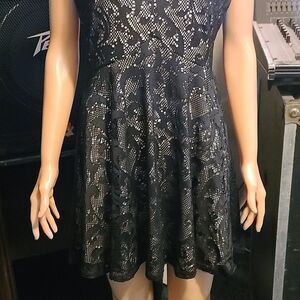 Beautiful black lace over cream dress featuring sleeveless, high slight turtle neckline, a double button keyhole enclosure in back, size large from Bailey blue. Excellent like new condition .