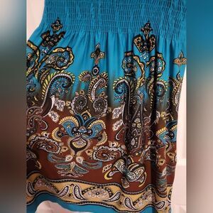 Beautiful dress! Lots of color. Can't read materials Tag. but feels like polyester and spandex materials. Tag says size medium. Tag is worn looking but dress in perfect condition. fabric stretches