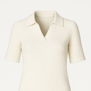 Soft ribbed texture, collared V-neck, short sleeves
