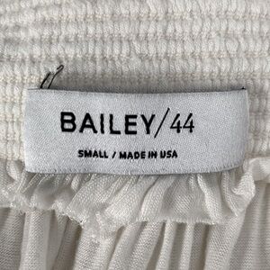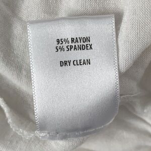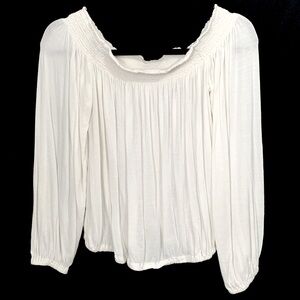 Good used condition. Pit to pit 16”, Length from shoulder 20”. Features an elastic stretch off-the-shoulder neckline, elastic cuffs and knotted front with elastic back hemline. Color is white.