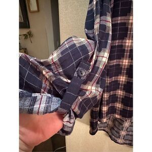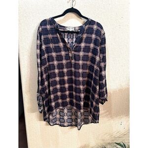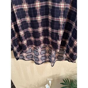 100% Rayon. armpit armpit is 23 inches and the length in the front is 26 inches. Button tabs on the sleeves.
