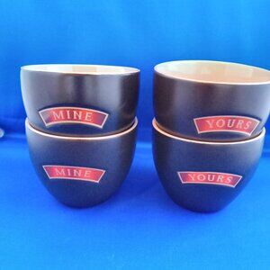 They are ceramic, black on the outside and tan on the inside. 2 say 'yours' and 2 say 'mine'.