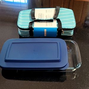 3 Pieces, rectangular glass casserole dish w/lid and Aqua insulated carrier case, dishwasher and microwave safe, pre-heated oven safe, freezer safe, NWT