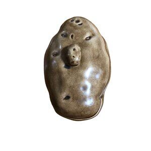 Vintage ceramic dish in the shape of a baked potato, brown in color, with a matching lid. Perfect for serving or storing casseroles. Its unique 1970s design makes it a fun, great party piece for any kitchen.