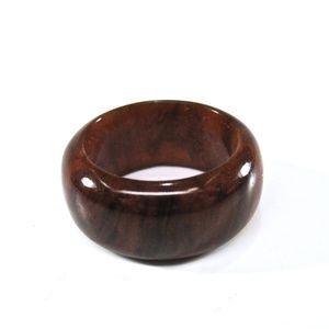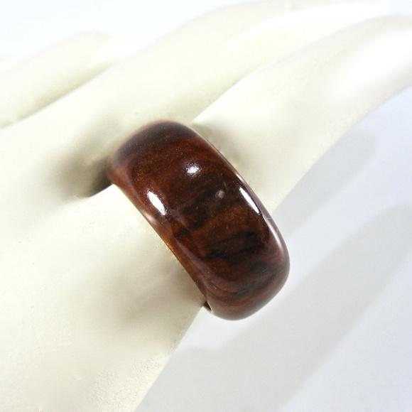 Root beer bakelite ring from the 1930’s-40’s. It’s a marbled dark brown and gold color. The ring is about a size 5.5 and is 3/8” wide. It’s in excellent vintage condition and would be a lovely gift idea. The ring has been tested and is shined up and ready to wear.