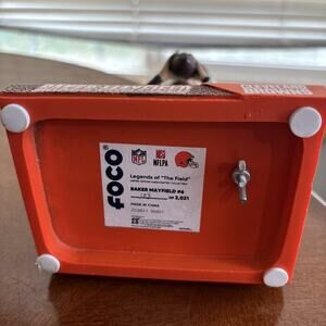 The product is a Baker Mayfield Cleveland Browns Big Ticket Series Bobblehead, measuring 8 inches tall. Officially licensed by the National Football League (NFL), this bobblehead features the Cleveland Browns quarterback, Baker Mayfield, in his team's brown uniform. It is a collectible item for fans of the Cleveland Browns and NFL football, made by the brand FOCO in China. Perfect for displaying on a desk, shelf, or in a sports memorabilia collection, this bobblehead captures the essence of the popular player and team.
