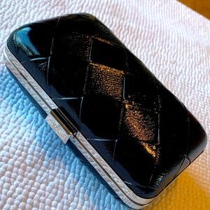 Elegant black quilted clutch. Shiny finish with silver accents. Perfect for evening outings.