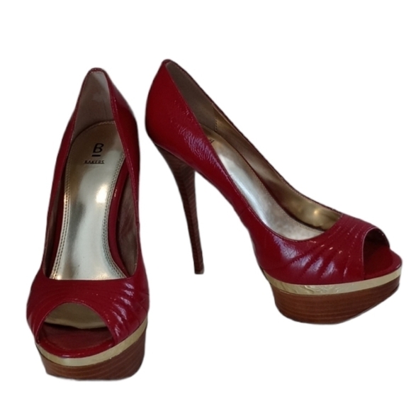Baker's SHAE platform heels. 5inch heel and a little over 1 inch on the front as pictured in photos has minor wear to the souls but the rest of the shoe looks great very little wear noted has a lot of life left in them.