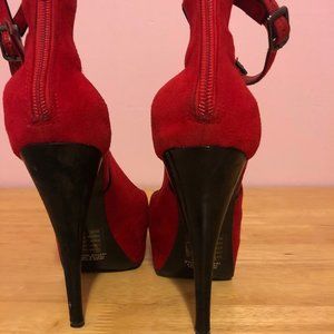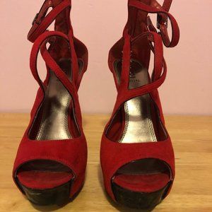 Bakers red suede strappy high platforms with black heel zip closure in the back.