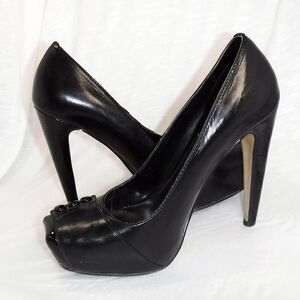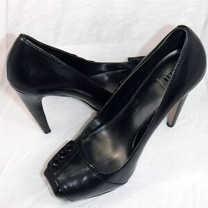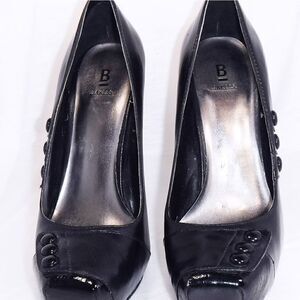 Bakers black leather square toe button heels