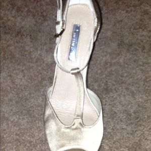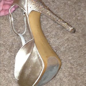 Only worn once! Beautiful champagne pumps with bling on the heel ! Bought them from Bakers . Size 8 . High heel but comfortable ! Do not have the box.