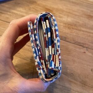 Fun canvas wallet bought in France from brand Bakker made with love. Size is approx 5 by 3 inches. Snap closure. Small mark on inside and a little wear on canvas but lots of life left in this cool wallet.