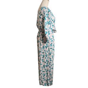 Chic jumpsuit with blue floral pattern on a pinkish background. Features a V-neck and three-quarter sleeves. WIde leg. Full stretch. Hook front. Couple of snaps inside not sure what for. Maybe had a cami??? Good condition Pockets