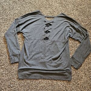 Chic and cozy charcoal sweatshirt. Features stylish back detail. Ideal for layering.