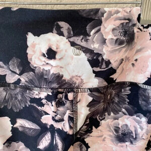 Black background with pink and white floral print. High waisted. Capri length leggings.