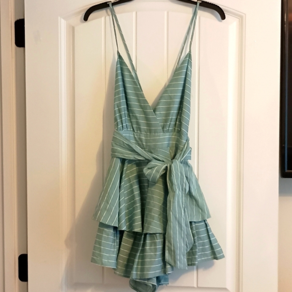 Balance v - neck adjustable spaghetti strap romper with ruffles. Zip closure in back and waist attached belt. new without tags