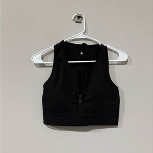 Keywords: sports bra, medium support, front zip closure, racerback, cropped fit, yoga, fitness, activewear, black bra, polyester, spandex, women's bra, wireless, solid pattern, pre-owned.