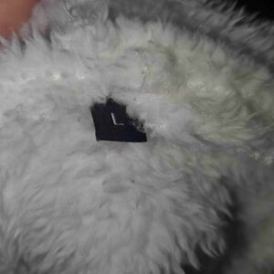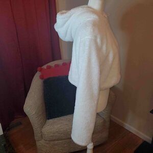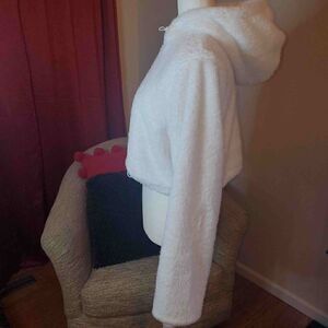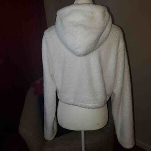 Balance Athletica. White, sherpah feel, cropped, cinch at neck and hem line, hooded, comfy pullover sweater. Size large.