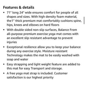 MSRP 59.99 BalanceFrom Fitness GoCloud 1" Extra Exercise Yoga Mat w/Carrying Strap, GreenOverview: With double sided non-slip surfaces, BalanceFrom All-Purpose Premium exercise yoga mat comes with an excellent slip resistant advantage to prevent injuries. Exceptional resilience allows you to keep your balance during any exercise style. moisture resistant technology makes the mat to be easily washed with soap and water. Easy strapping and light weight feature are added to this mat for easy transport and storage. Dimensions: 71" long 24" wide ensures comfort for people of all shapes and sizes. With high density foam material, the 1'' thick premium mat comfortably cushions spine, hips, knees and elbows on hard floors.